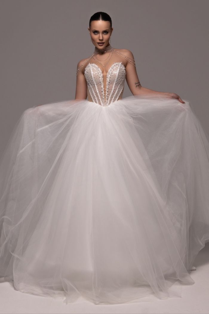 Роскошное свадебное платье А-силуэта с прозрачным расшитым корсетом